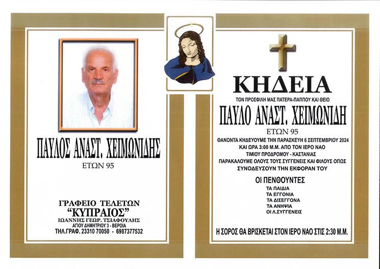 Έφυγε από τη ζωή και κηδεύεται αύριο Παρασκευή 6 Σεπτεμβρίου 2024 στις 3.00 μ.μ. από τον Ιερό Ναό Τίμιου Προδρόμου – Καστανιάς, ο Παύλος Αναστ. Χειμωνίδης σε ηλικία 95 ετών.