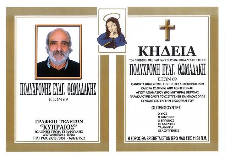 Έφυγε από τη ζωή και κηδεύεται αύριο Τρίτη 3 Δεκεμβρίου 2024 στις 12.00 μ.μ. από τον Ιερό Ναό Αγίου Αθανασίου (Κοιμητήρια) Βέροιας, ο Πολυχρόνης Ευαγ. Θωμαδάκης σε ηλικία 69 ετών.