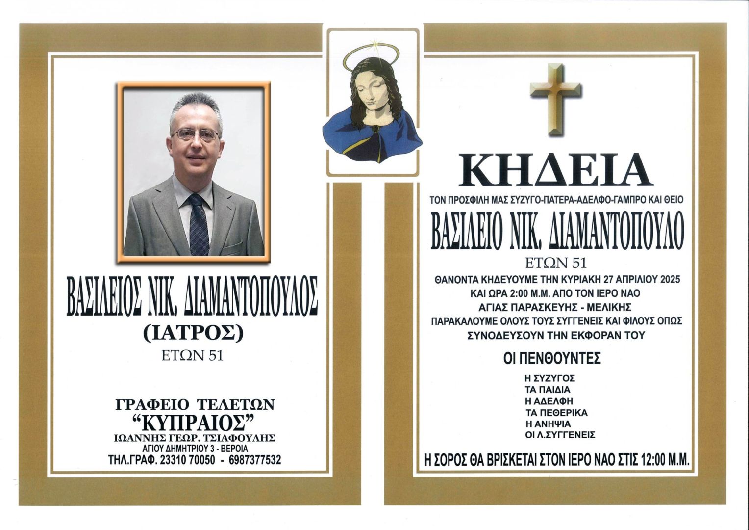 Η κηδεία του θα τελεστεί την Κυριακή 27 Απριλίου 2025,