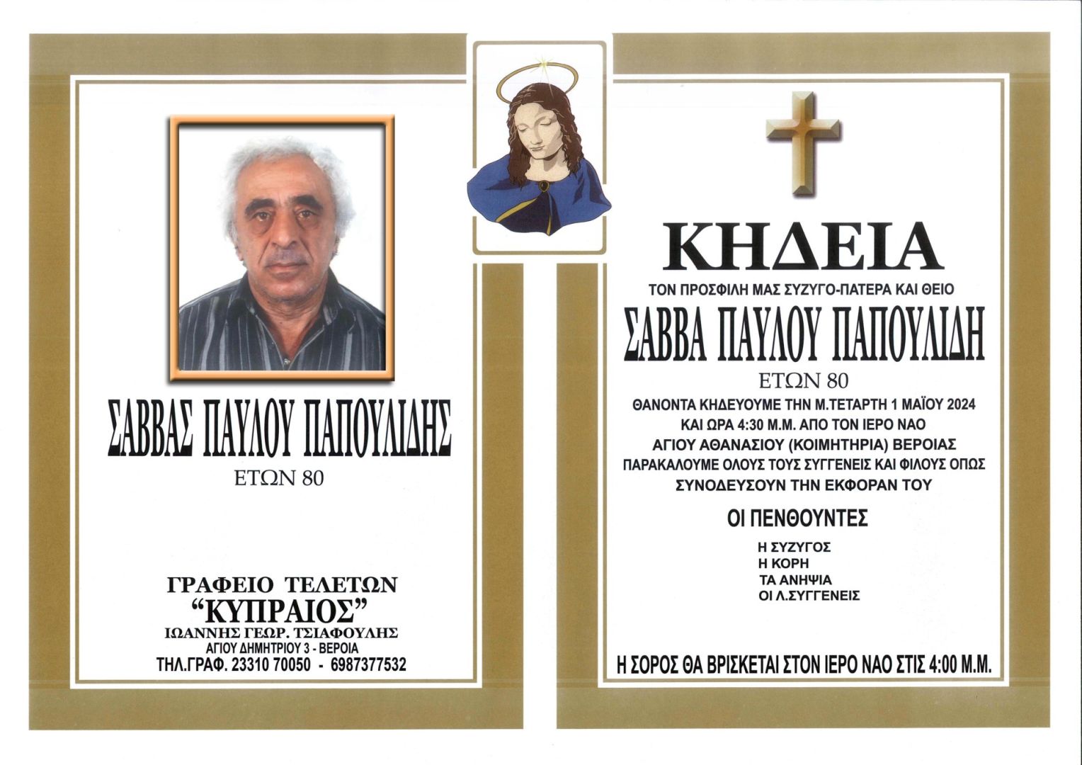 Έφυγε από τη ζωή και κηδεύεται σήμερα Μ. Τετάρτη 1 Μαΐου 2024 στις 4.30 μ.μ. από τον Ιερό Ναό Αγίου Αθανασίου (Κοιμητήρια) Βέροιας ο Σάββας Παύλου Παπουλίδης σε ηλικία 80 ετών.