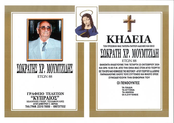 Έφυγε από τη ζωή και κηδεύεται αύριο Τετάρτη 23 Οκτωβρίου 2024 στις 10.00 π.μ. από τον Ιερό Ναό Κοιμήσεως Της Θεοτόκου – Αγίου Γεωργίου Δ. Δοβρά, ο Σωκράτης Χρ. Μουμτζίδης σε ηλικία 88 ετών.