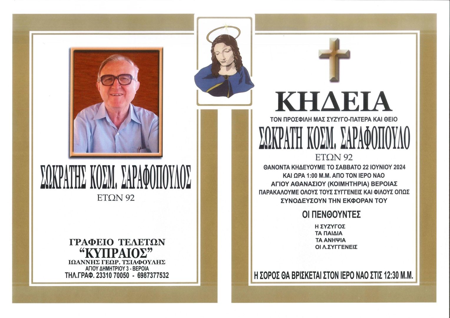 Έφυγε από τη ζωή και κηδεύεται το Σάββατο 22 Ιουνίου 2024 στις 1.00 μ.μ. από τον Ιερό Ναό Αγίου Αθανασίου (Κοιμητήρια) Βέροιας ο Σωκράτης Κοσμ. Σαραφόπουλος σε ηλικία 92 ετών.