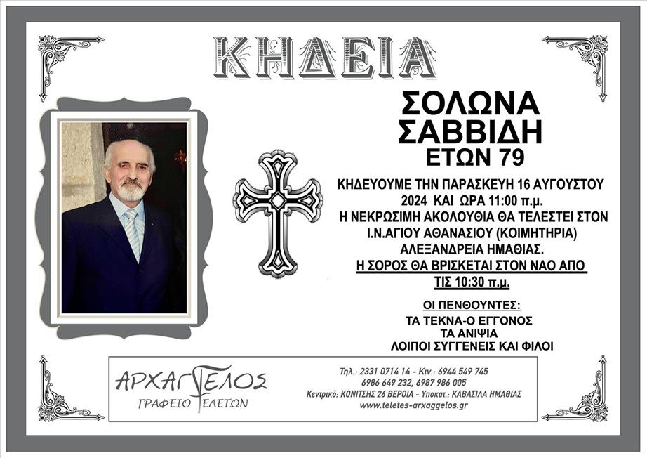 Έφυγε από τη ζωή και κηδεύεται την Παρασκευή 16 Αυγούστου 2024 στις 11.00 π.μ. από τον Ιερό Ναό Αγίου Αθανασίου (Κοιμητήρια) Αλεξάνδρειας ο Σόλωνας Σαββίδης σε ηλικία 79 ετών.