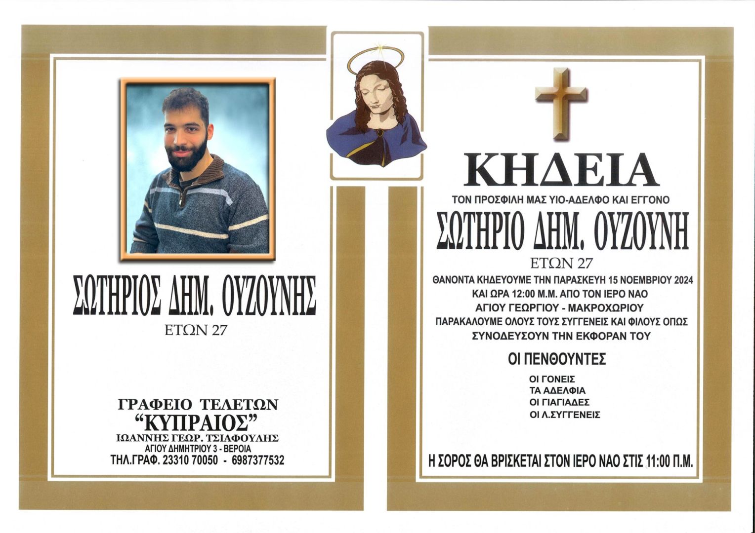 Η κηδεία του θα γίνει την Παρασκευή 15 Νοεμβρίου 2024 στις 12.00 μ.μ. από τον Ιερό Ναό Αγίου Γεωργίου στο Μακροχώρι.