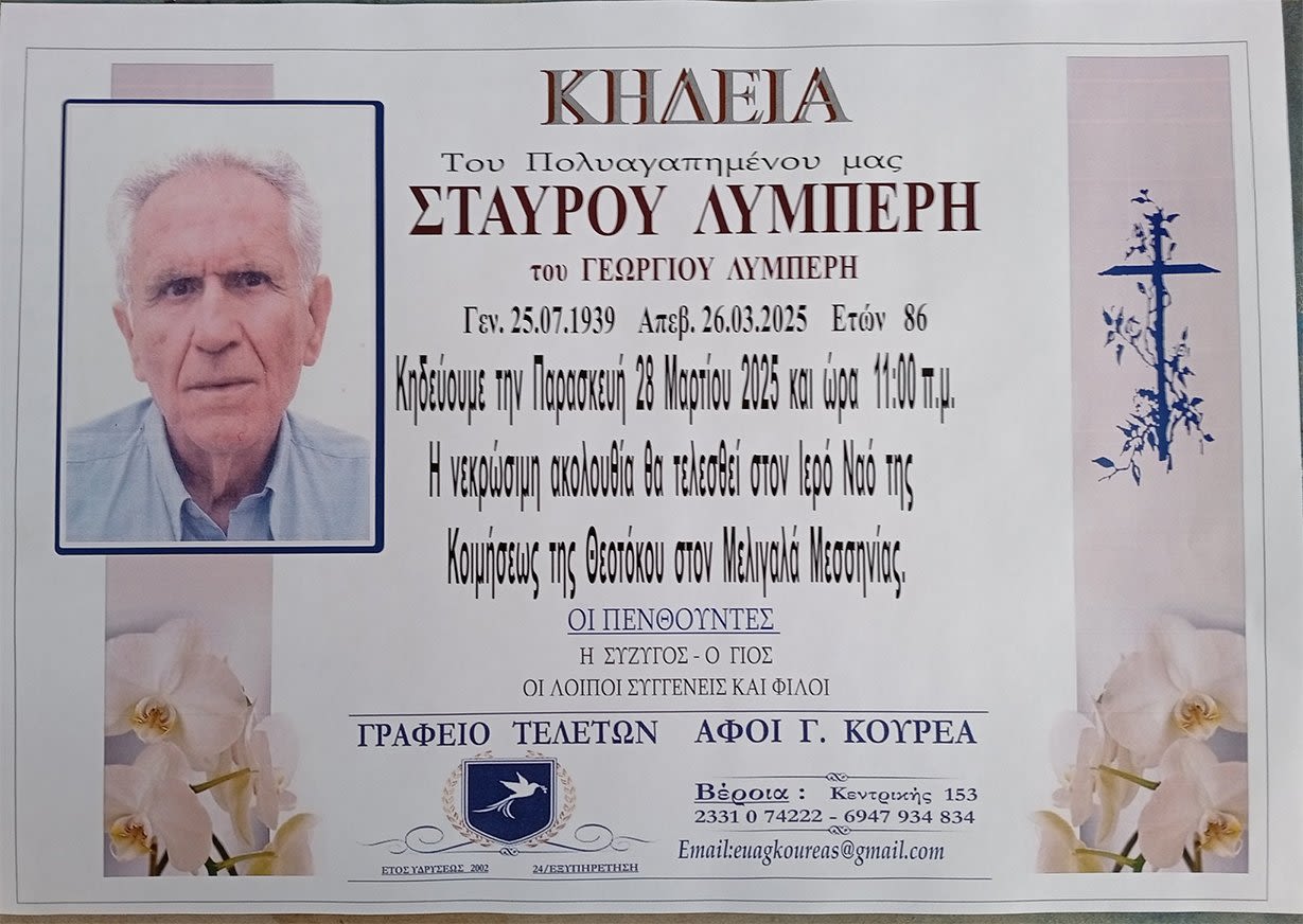 Έφυγε από τη ζωή και κηδεύεται σήμερα Παρασκευή 28 Μαρτίου 2025 στις 11.00 π.μ. από τον Ιερό Ναό Κοιμήσεως της Θεοτόκου στον Μελιγαλά Μεσσηνίας ο Σταύρος Γεωργ. Λυμπέρης σε ηλικία 86 ετών.