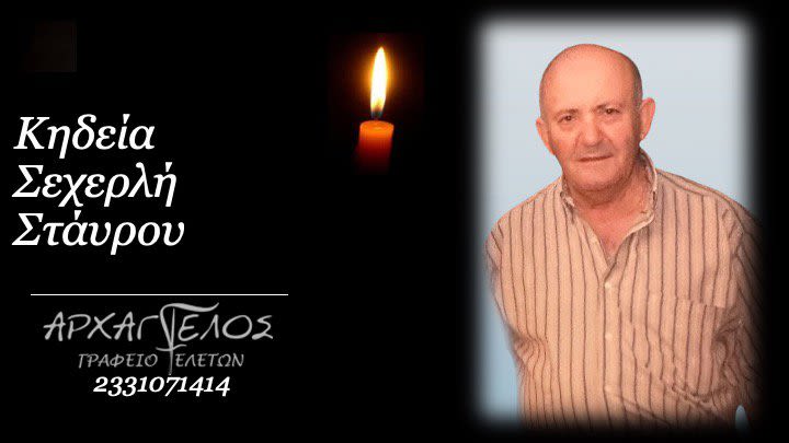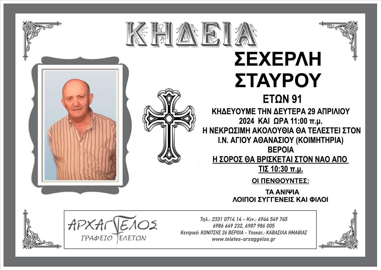 Έφυγε από τη ζωή και κηδεύεται την Δευτέρα 29 Απριλίου 2024 στις 11.00 π.μ. στον Ιερό Ναό Αγίου Αθανασίου (Κοιμητήρια) Βέροιας ο Σταύρος Σεχερλής σε ηλικία 91 ετών.
