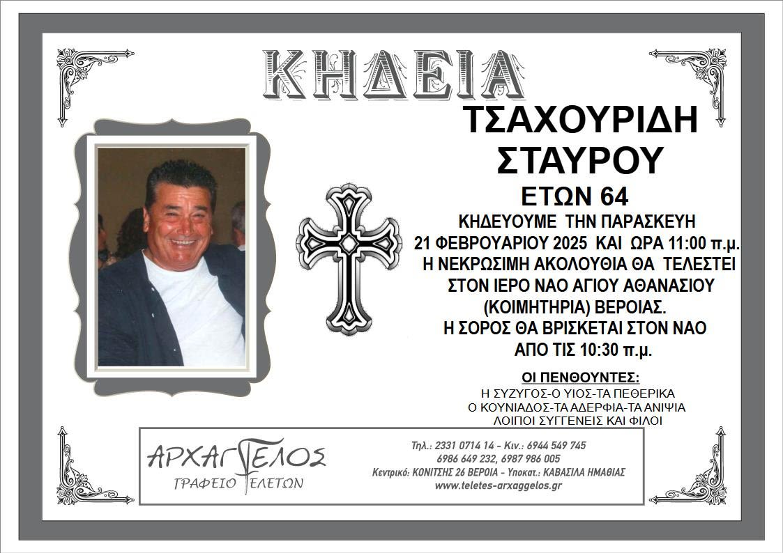 Έφυγε από τη ζωή και κηδεύεται την Παρασκευή 21 Φεβρουαρίου 2025 στις 11.00 π.μ. από τον Ιερό Ναό Αγίου Αθανασίου (Κοιμητήρια) Βέροιας ο Σταύρος Τσαχουρίδης σε ηλικία 64 ετών.