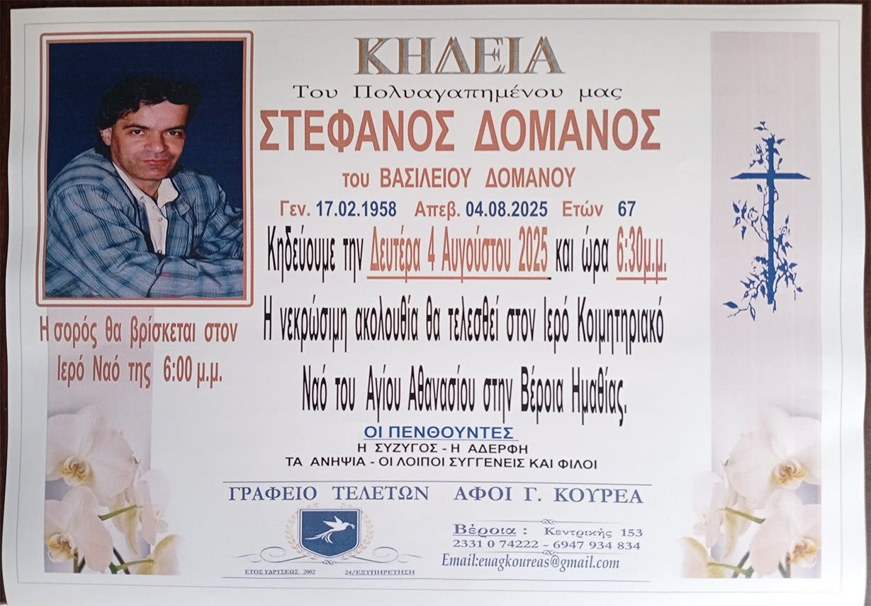 Έφυγε από τη ζωή και κηδεύεται σήμερα Δευτέρα 4 Αυγούστου 2025 στις 6.30 μ.μ. από τον Ιερό Ναό Αγίου Αθανασίου (Κοιμητήρια) Βέροιας ο Στέφανος Δομανος σε ηλικία 67 ετών.