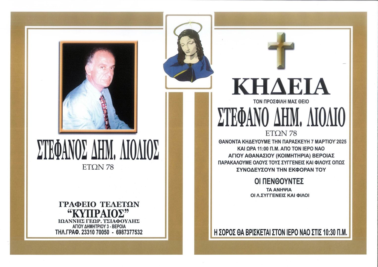 Έφυγε από τη ζωή και κηδεύεται την Παρασκευή 7 Μαρτίου 2025 στις 11.00 π.μ. από τον Ιερό Ναό Αγίου Αθανασίου (Κοιμητήρια) Βέροιας ο Στέφανος Δημ. Λιόλιος σε ηλικία 78 ετών.