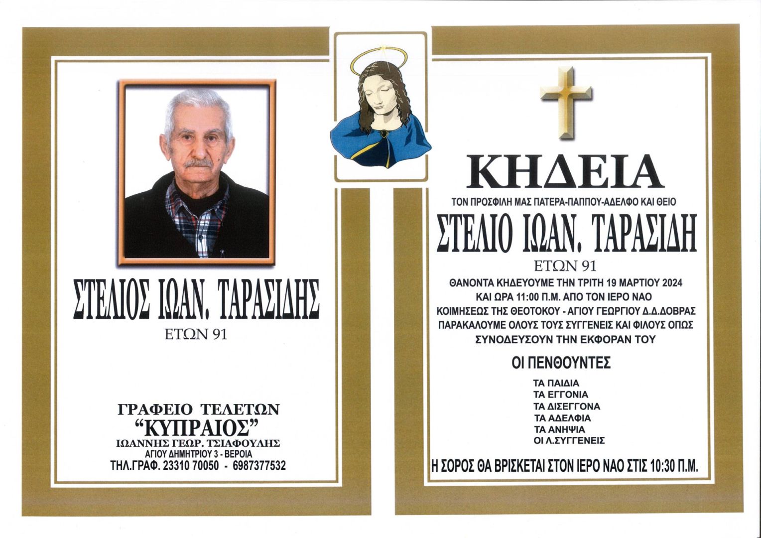 Έφυγε από τη ζωή και κηδεύεται την Τρίτη 19 Μαρτίου 2024 στις 11.00 π.μ. από τον Ιερό Ναό Κοιμήσεως της Θεοτόκου Αγίου Γεωργίου Δ.Δ. Δοβρά ο Στέλιος Ιωαν. Ταρασίδης σε ηλικία 91 ετών.