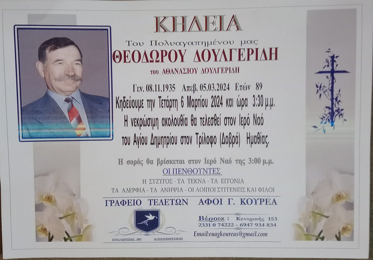 Έφυγε από τη ζωή και κηδεύτηκε σήμερα Τετάρτη 6 Μαρτίου 2024 στις 3.30 μ.μ. από τον Ιερό Ναό Αγίου Δημητρίου στον Τρίλοφο (Δοβρά) Ημαθίας ο Θεόδωρος Αθαν. Δουλγερίδης σε ηλικία 89 ετών.