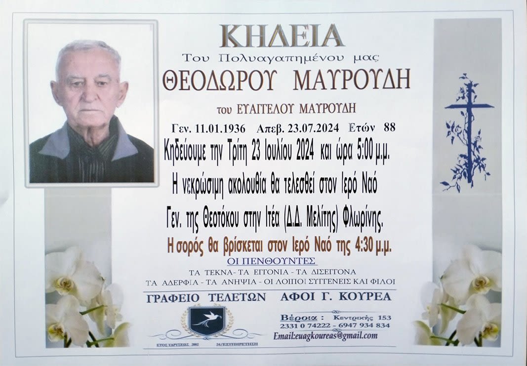 Έφυγε από τη ζωή και κηδεύεται σήμερα Τρίτη 23 Ιουλίου 2024 στις 5.00 μ.μ. από τον Ιερό Ναό Γεννήσεως της Θεοτόκου στην Ιτέα (Δ.Δ. Μελίτης) Φλωρίνης ο Θεόδωρος Ευαγγ. Μαυρουδής σε ηλικία 88 ετών.