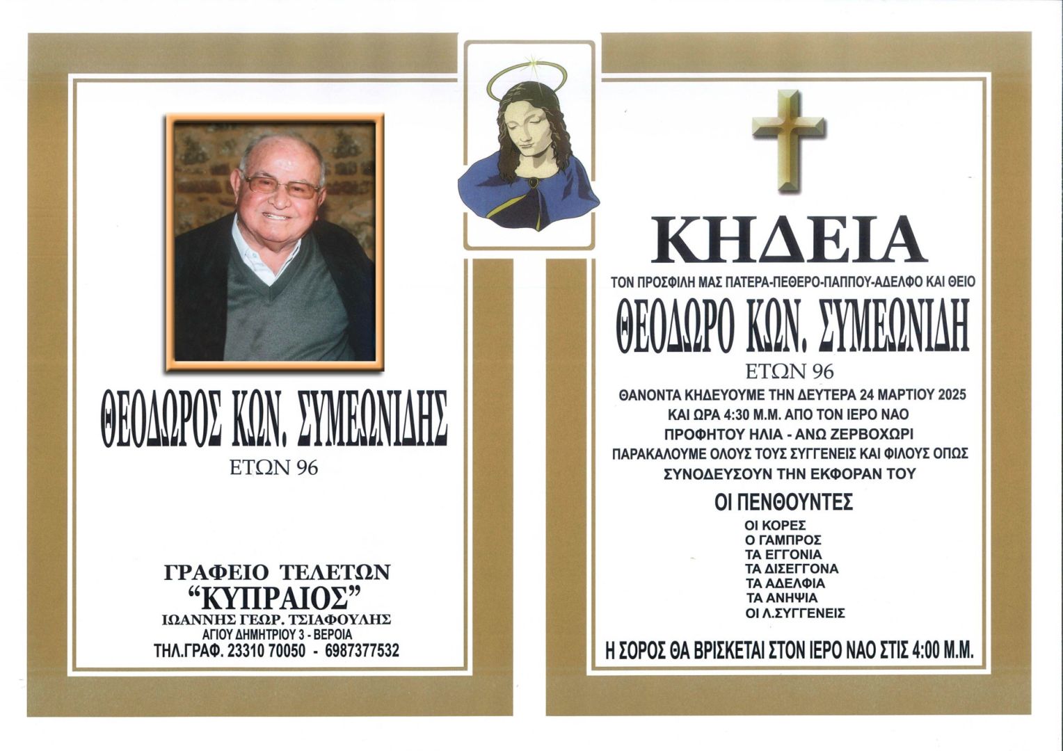 Έφυγε από τη ζωή και κηδεύεται σήμερα Δευτέρα 24 Μαρτίου 2025 στις 4.30 μ.μ. από τον Ιερό Ναό Προφήτου Ηλία Άνω Ζερβοχωρίου ο Θεόδωρος Κων. Συμεωνίδης σε ηλικία 96 ετών.