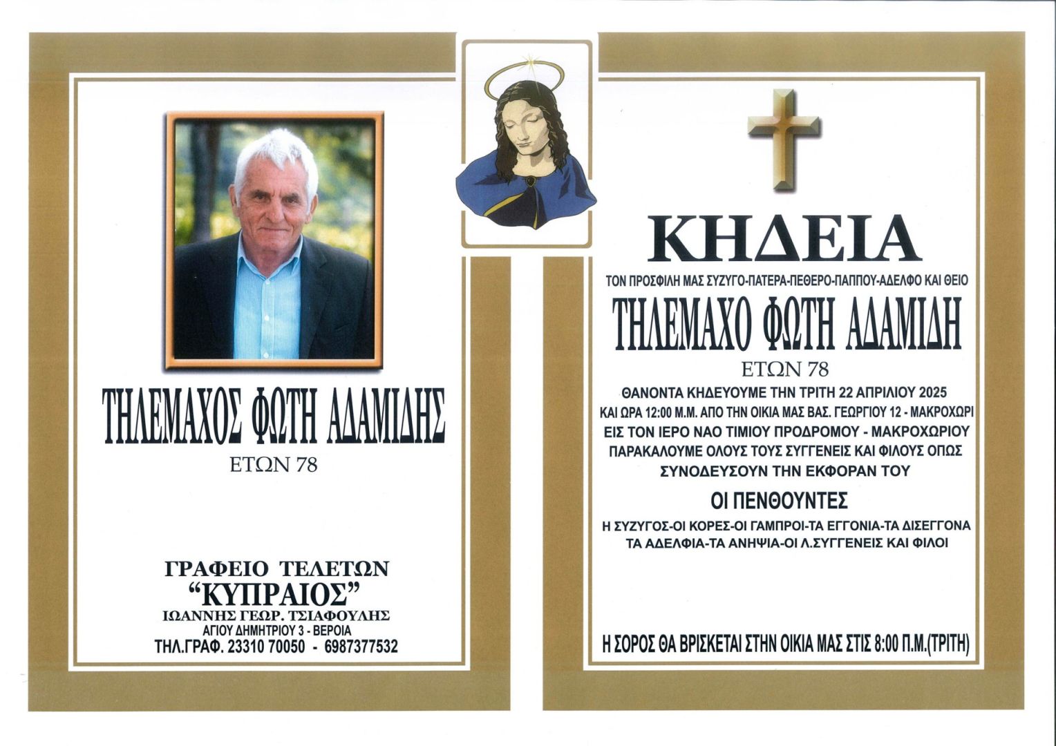 Έφυγε από τη ζωή και κηδεύεται την Τρίτη 22 Απριλίου 2025 στις 12.00 μ.μ. από τον Ιερό Ναό Τιμίου Προδρόμου Μακροχωρίου ο Τηλέμαχος Φωτ. Αδαμίδης σε ηλικία 78 ετών.