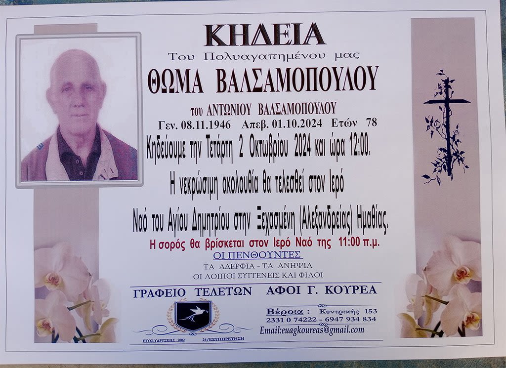 Έφυγε από τη ζωή και κηδεύεται την Τετάρτη 2 Οκτωβρίου 2024 στις 12.00 μ.μ. από τον Ιερό Ναό Αγίου Δημητρίου στην Ξεχασμένη Ημαθίας ο Θωμάς Αντ. Βαλσαμόπουλος σε ηλικία 78 ετών.