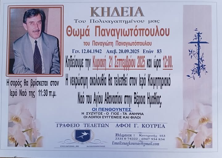 Έφυγε από τη ζωή και κηδεύεται την Κυριακή 21 Σεπτεμβρίου 2025 στις 12.00 μ.μ. από τον Ιερό Ναό Αγίου Αθανασίου (Κοιμητήρια) Βέροιας ο Θωμά Παναγ. Παναγιωτόπουλος σε ηλικία 83 ετών.