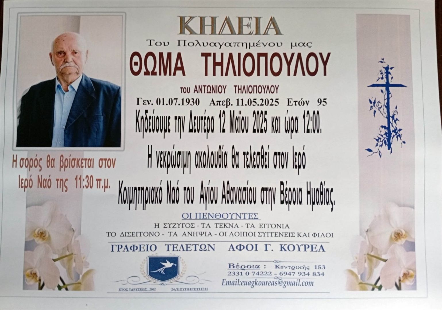 Έφυγε από τη ζωή και κηδεύεται την Δευτέρα 12 Μαΐου 2025 στις 12.00 μ.μ. από τον Ιερό Ναό Αγίου Αθανασίου (Κοιμητήρια) Βέροιας ο Θωμάς Αντ. Τηλιόπουλος σε ηλικία 95 ετών.