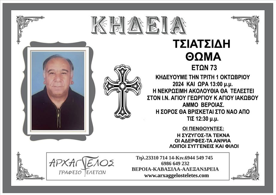 Έφυγε από τη ζωή και κηδεύεται σήμερα Τρίτη 1 Οκτωβρίου 2024 στις 1.00 μ.μ. από τον Ιερό Ναό Αγίου Γεωργίου και Αγίου Ιακώβου στην Άμμο Βέροιας ο Θωμάς Τσιατσίδης σε ηλικία 73 ετών.