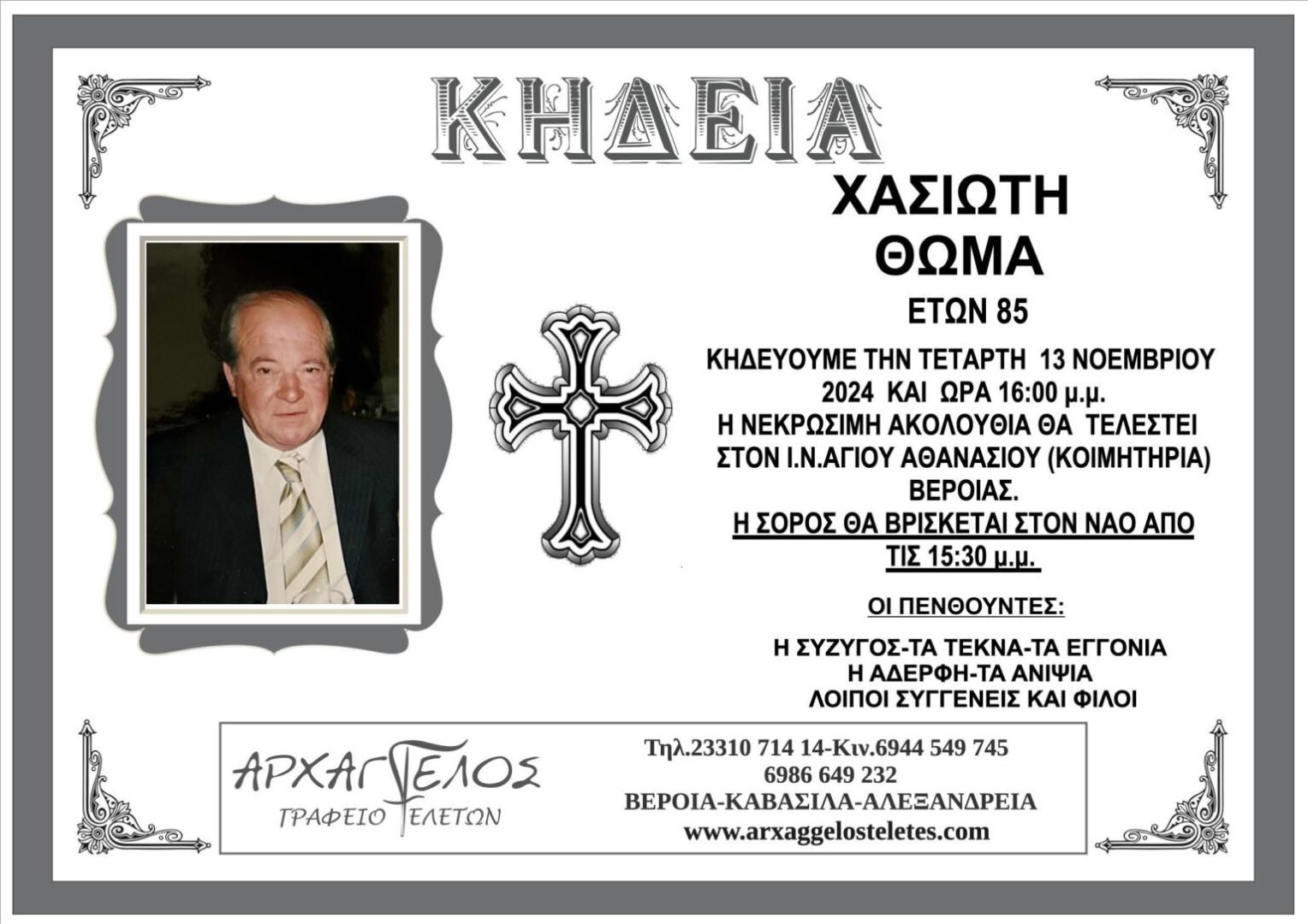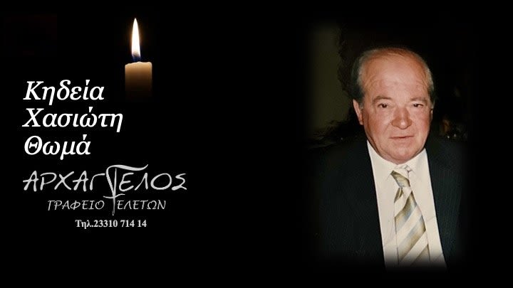 Έφυγε από τη ζωή και κηδεύεται την Τετάρτη 13 Νοεμβρίου 2024 στις 4.00 μ.μ. από τον Ιερό Ναό Αγίου Αθανασίου (Κοιμητήρια) Βέροιας ο Θωμάς Χασιώτης σε ηλικία 85 ετών.