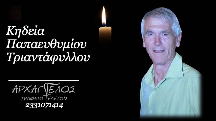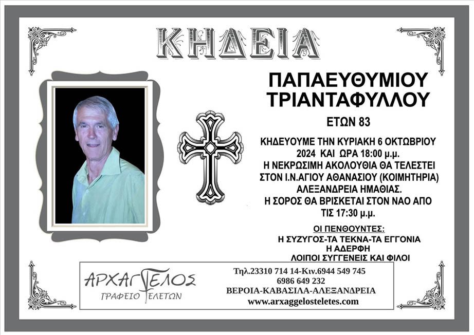 Έφυγε από τη ζωή και κηδεύεται σήμερα Κυριακή 6 Οκτωβρίου 2024 στις 6.00 μ.μ. από τον Ιερό Ναό Αγίου Αθανασίου (Κοιμητήρια) Αλεξάνδρειας ο Τριαντάφυλλος Παπαευθυμίου σε ηλικία 83 ετών.