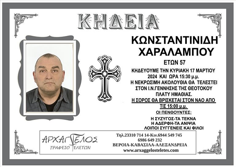 Έφυγε από τη ζωή και κηδεύεται την Κυριακή 17 Μαρτίου 2024 στις 3.30 μ.μ. από τον Ιερό Ναό Γεννήσεως της Θεοτόκου στο Πλατύ Ημαθίας ο Χαράλαμπος Κωνσταντινίδης σε ηλικία 57 ετών.