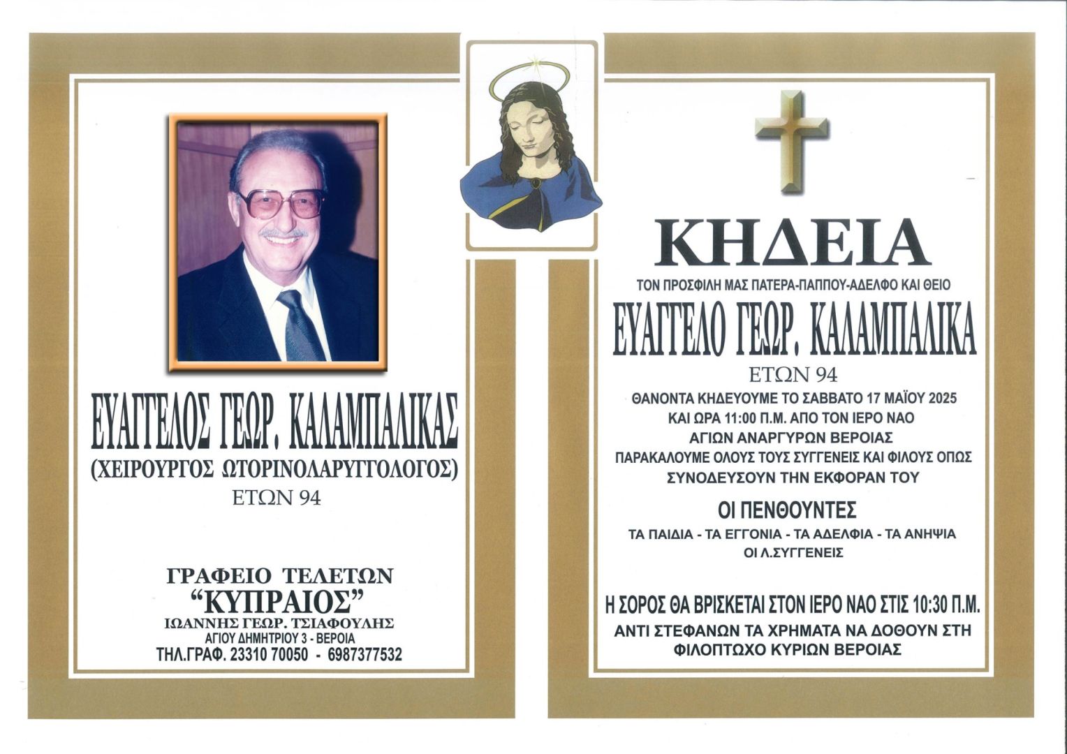 Έφυγε από τη ζωή και κηδεύεται το Σάββατο 17 Μαΐου 2025 στις 11.00 π.μ. από τον Ιερό Ναό Αγίων Αναργύρων Βέροιας ο  Ευάγγελος Γεωρ. Καλαμπαλίκας, χειρουργός ωτορινολαρυγγολόγος,  σε ηλικία 94 ετών. Η σορός θα βρίσκεται στον Ιερό Ναό στις 10.30 π.μ. Αντί στεφάνων τα χρήματα να δοθούν στην Φιλόπτωχο Κυριών Βέροιας.