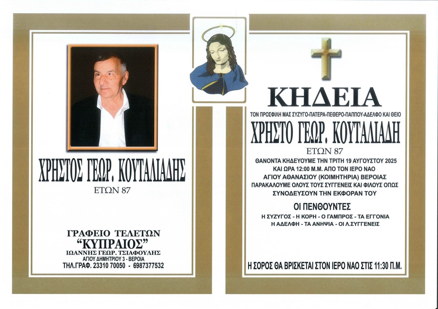 Έφυγε από τη ζωή και κηδεύτηκε σήμερα Τρίτη 19 Αυγούστου 2025 στις 12.00 μ.μ. από τον Ιερό Ναό Αγίου Αθανασίου (Κοιμητήρια) Βέροιας ο Χρήστος Γεωρ. Κουταλιάδης σε ηλικία 87 ετών.