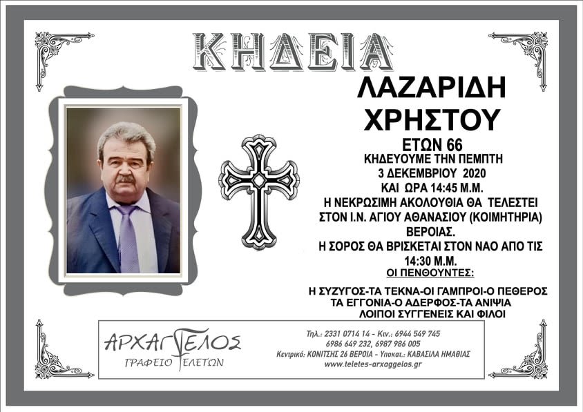“Έφυγε” από τη ζωή ο Χρήστος Λαζαρίδης σε ηλικία 66 ετών. Η κηδεία θα τελεστεί σήμερα, Πέμπτη 3 Δεκεμβρίου, στις 14:45 στον Ιερό Ναό Αγίου Αθανασίου Βέροιας (Κοιμητήρια). Η σωρός θα βρίσκεται στον Ναό από τις 14:30.