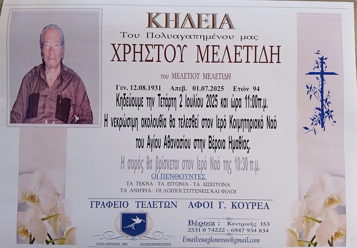 Έφυγε από τη ζωή και κηδεύεται την Τετάρτη 2 Ιουλίου 2025 στις 11.00 π.μ. από τον Ιερό Ναό Αγίου Αθανασίου (Κοιμητήρια) Βέροιας ο Χρήστος Μελ. Μελετίδης σε ηλικία 94 ετών.