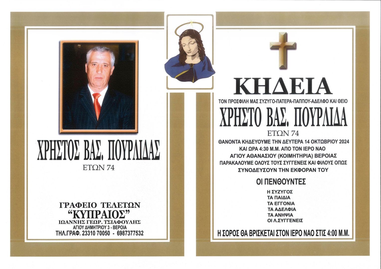 Έφυγε από τη ζωή και κηδεύεται την Δευτέρα 14 Οκτωβρίου 2024 στις 4.30 μ.μ. από τον Ιερό Ναό Αγίου Αθανασίου (Κοιμητήρια) Βέροιας ο Χρήστος Βασ. Πουρλίδας σε ηλικία 74 ετών.