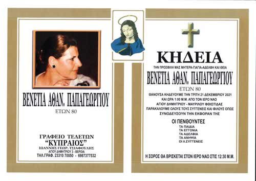 Η Βενετία Παπαγεωργίου, μια εξαιρετική προσωπικότητα της βεροιώτικης κοινωνίας,  έφυγε την Κυριακή (20/12) σε ηλικία 80 ετών. Μητέρα του γνωστού φιλολόγου Αριστοτέλη Παπαγεωργίου, ήταν ιδιαίτερα χαρακτηριστική για την ευγένεια και την αρχοντιά της.