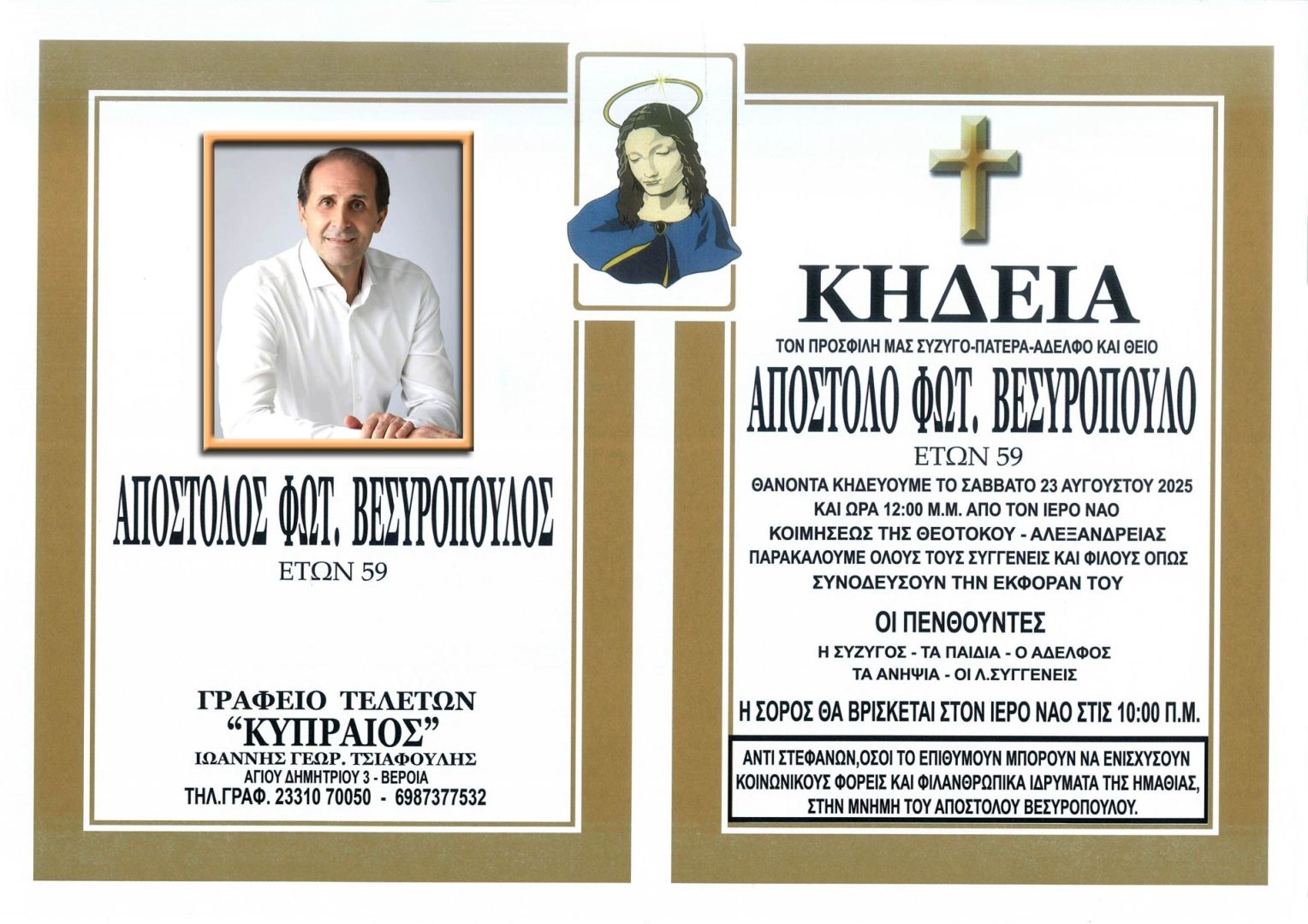 Το Σάββατο 23 Αυγούστου 2025 στις 12.00 μμ. θα πραγματοποιηθεί η κηδεία του Απόστολου Βεσυρόπουλου από τον Ιερό Ναό Κοιμήσεως της Θεοτόκου Αλεξάνδρειας. Η οικογένεια επιθυμεί αντί στεφάνων στη μνήμη του, όσοι το επιθυμούν να ενισχύσουν κοινωνικούς φορείς και φιλανθρωπικά ιδρύματα της Ημαθίας.
