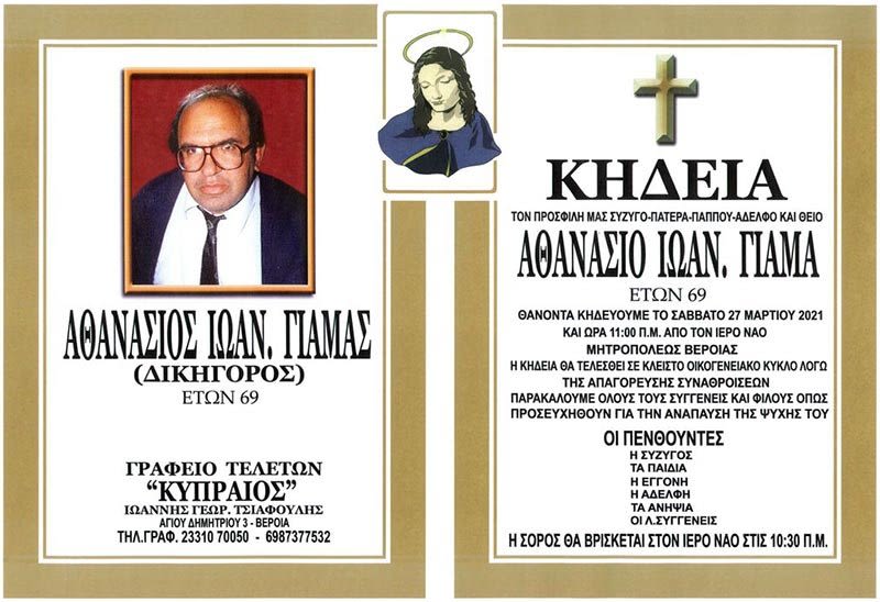 Έφυγε σε ηλικία 69 ετών ο δικηγόρος Βέροιας Θανάσης Γιαμάς.