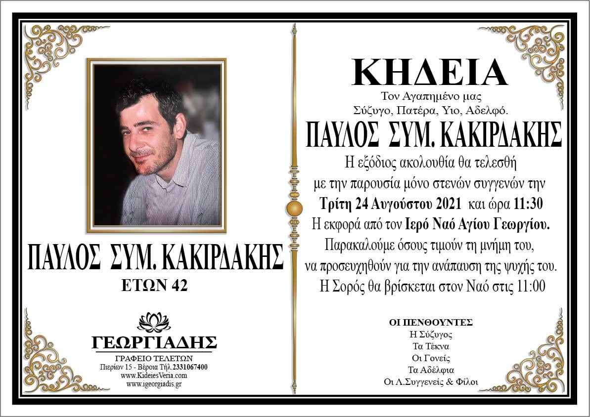 Απεβίωσε σε ηλικία 42 ετών ο Παύλος Κακιρδάκης. Η κηδεία θα γίνει την Τρίτη 24 Αυγούστου 2021 στις 11:30 π.μ. με την παρουσία μόνο στενών συγγενών, στον Ιερό Ναό Αγίου Γεωργίου.