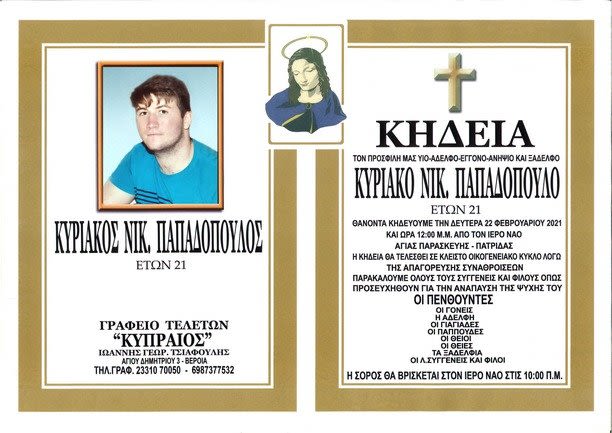 Έφυγε από την ζωή σε ηλικία μόλις 21 ετών ο Κυριάκος Νικ. Παπαδόπουλος. Η κηδεία του θα γίνει την Δευτέρα 22 Φεβρουαρίου 2021 και ώρα 12:00 το μεσημέρι από τον Ιερό Ναό Αγίας Παρασκευής Πατρίδας.