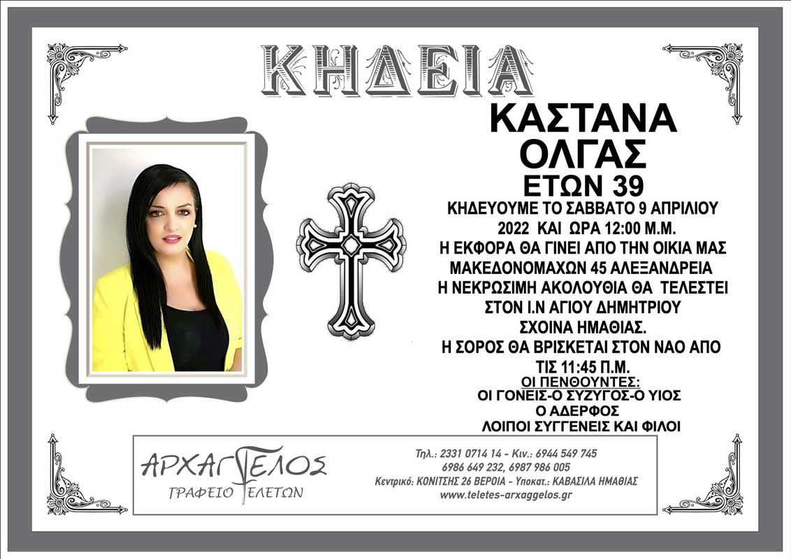 “Έφυγε” σε ηλικία 39 ετών η Όλγα Καστανά. η κηδεία θα γίνει το Σάββατο 9 Απριλίου 2022 στις 12:00μ.μ. Η νεκρώσιμη ακολουθία θα τελεστεί στον Ιερό Ναό Αγίου Δημητρίου στον Σχοινά Ημαθίας.