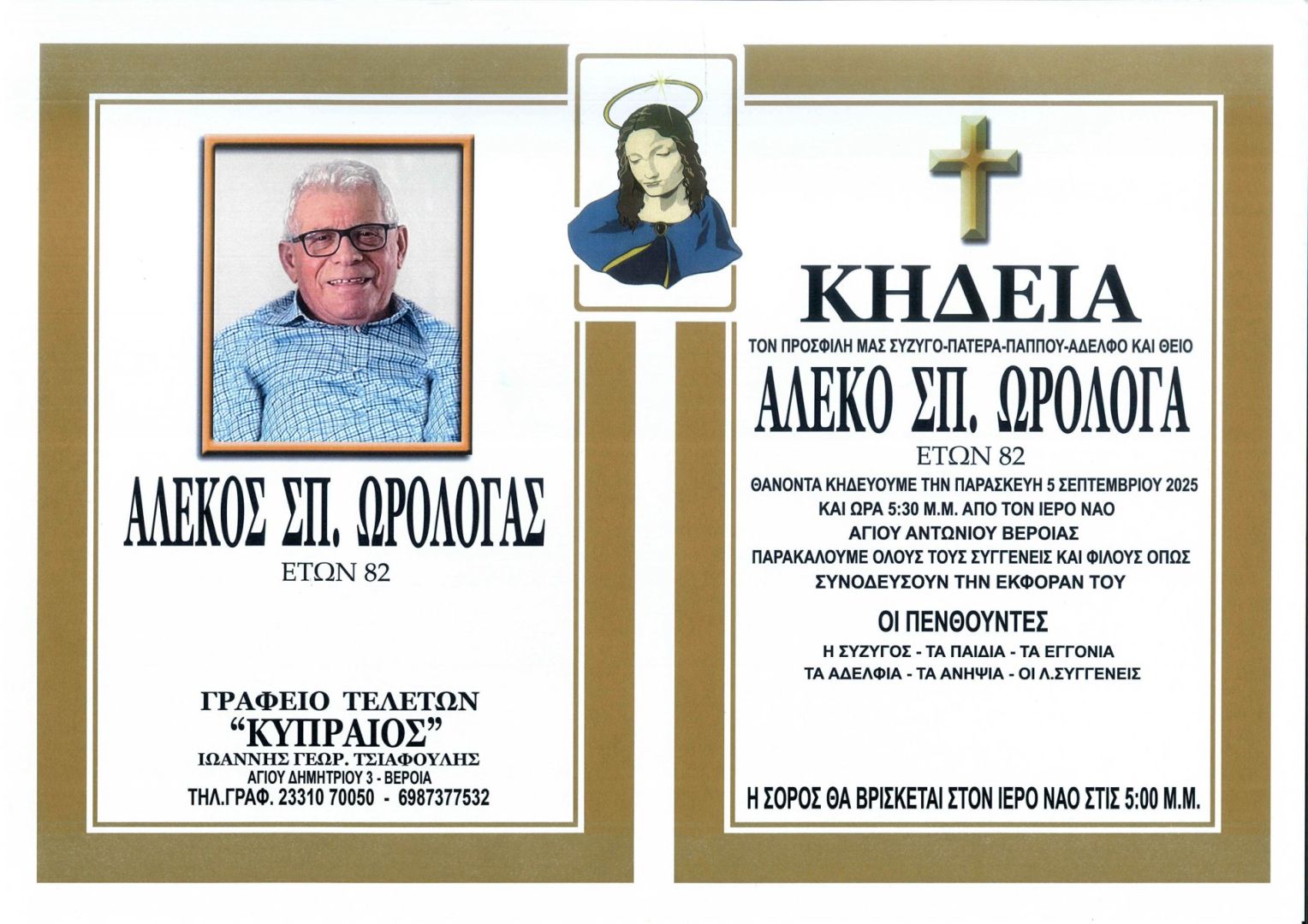 Έφυγε από τη ζωή σε ηλικία 82 ετών ο Αλέκος Ωρολογάς, από τους παλαιότερους λογιστές και πρωτοπόρος του κλάδου στη Βέροια. Διετέλεσε πρόεδρος του τότε Συλλόγου Λογιστών και μετέπειτα Ένωσης Φοροτεχνικών Ημαθίας ενώ υπήρξε μέλος του ΔΣ του Επιμελητηρίου Ημαθίας και πρόεδρός του για κάποιο χρονικό διάστημα.