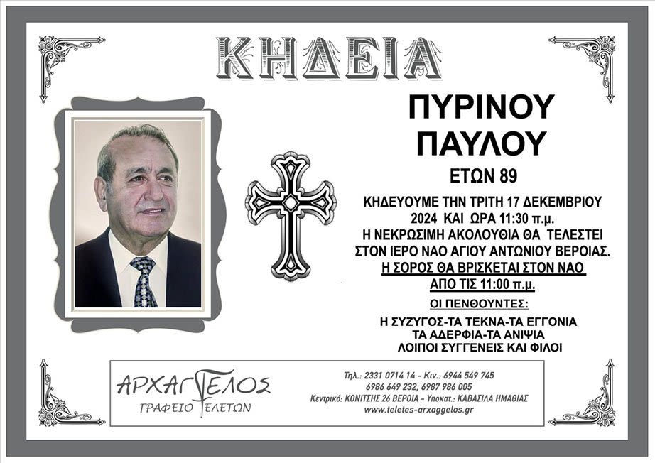 Η κηδεία του θα γίνει αύριο Τρίτη 17 Δεκεμβρίου 2024, από τον Ιερό Ναό του πολιούχου Αγίου Αντωνίου στη Βέροια, στις 11:30 το πρωί.