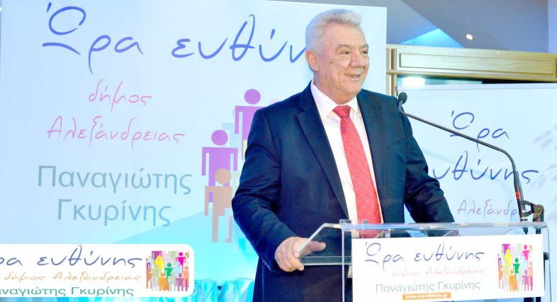Ο δήμαρχος Αλεξάνδρειας Παναγιώτης Γκυρίνης παρουσίασε τις βασικές αρχές του συνδυασμού και όπως τόνισε στην ομιλία του το πρόγραμμα της “ΩΡΑΣ ΕΥΘΥΝΗΣ” είναι συνέχεια του προγράμματος της προηγούμενης πενταετίας στο οποίο θα προστεθούν νέοι στόχοι και νέες πρωτοποριακές προτάσεις.