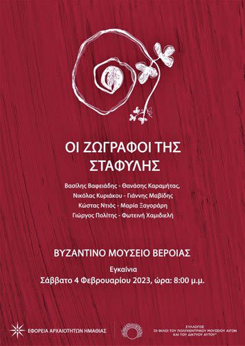 Η Εφορεία Αρχαιοτήτων Ημαθίας και οι Φίλοι του Πολυκεντρικού Μουσείου των Αιγών και του Δικτύου του με χαρά σας προσκαλούν στα εγκαίνια της ομαδικής εικαστικής έκθεσης «Οι ζωγράφοι της Σταφυλής», που θα πραγματοποιηθούν το Σάββατο 04 Φεβρουαρίου 2023 και ώρα 20:00 στο Βυζαντινό Μουσείο Βέροιας (αίθουσα περιοδικών εκθέσεων στο ισόγειο του μουσείου).
