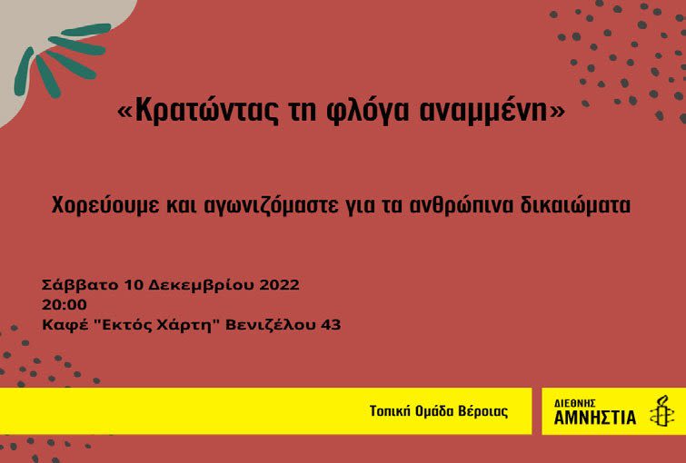Στις 10 Δεκεμβρίου, Παγκόσμια Ημέρα για τα ανθρώπινα δικαιώματα, ως Τοπική Ομάδα Βέροιας της Διεθνούς Αμνηστίας, σας καλούμε να γνωρίσετε τη δράση μας και στο πλαίσιο μιας ξεχωριστής μουσικοχορευτικής εκδήλωσης να ενώσουμε τις δυνάμεις μας ώστε να κρατήσουμε τη φλόγα αναμμένη!