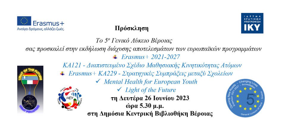 Το 5ο Γενικό Λύκειο Βέροιας διοργανώνει τη Δευτέρα 26 Ιουνίου 2023 στις 5.30 μ.μ. στη Δημόσια Κεντρική Βιβλιοθήκη Βέροιας εκδήλωση διάχυσης των ευρωπαϊκών προγραμμάτων :