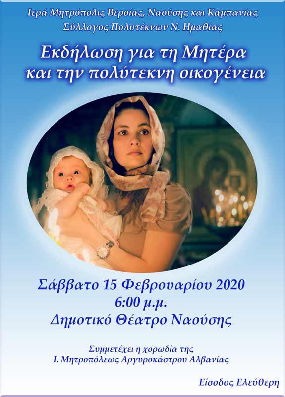 Η Ιερά Μητρόπολη Βεροίας, Ναούσης και Καμπανίας σε συνεργασία με τον Σύλλογο Πολυτέκνων Νομού Ημαθίας διοργανώνουν το Σάββατο 15 Φεβρουαρίου και ώρα 6:00 μ.μ. στο Δημοτικό Θέατρο Ναούσης, εορταστική εκδήλωση για να τιμήσει τη Μητέρα και την πολύτεκνη οικογένεια.