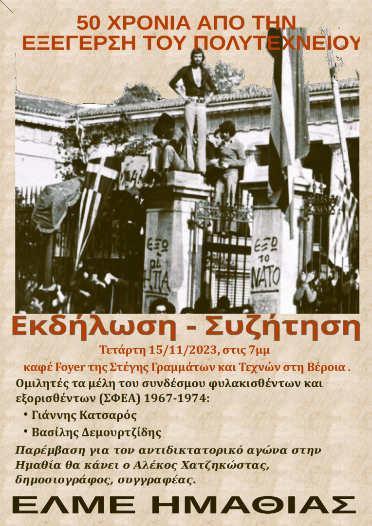 Εκδήλωση – Συζήτηση με αφορμή την επέτειο του Πολυτεχνείου θα πραγματοποιηθεί την Τετάρτη 15/11 στο Foyer της Στέγης Γραμμάτων και Τεχνών στην Βέροια .
