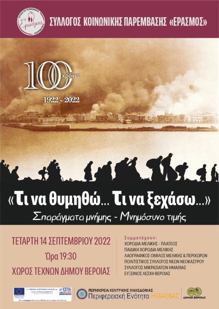 Με αφορμή τη συμπλήρωση 100 χρόνων από τη Μικρασιατική καταστροφή, ο Σύλλογος Κοινωνικής Παρέμβασης «ΕΡΑΣΜΟΣ» παρουσιάζει, το απόγευμα της Τετάρτης 14 Σεπτεμβρίου 2022, στις 19.30, στο Χώρο Τεχνών του Δήμου Βέροιας μουσικο-θεατρικό δρώμενο με τίτλο: 1922-2022. «Τι να θυμηθώ, τι να ξεχάσω…».Σπαράγματα μνήμης – Μνημόσυνο τιμής για τα 100 χρόνια από τη Μικρασιατική Καταστροφή. Στην εκδήλωση συμμετέχουν η Χορωδία Μελίκης – Πλατέος, η Παιδική χορωδία Μελίκης, ο Λαογραφικός Όμιλος Μελίκης και Περιχώρων, ο Πολιτιστικός Σύλλογος Νέων Νεοκάστρου, ο Σύλλογος Μικρασιατών Ημαθίας και η Εύξεινος Λέσχη Βέροιας.