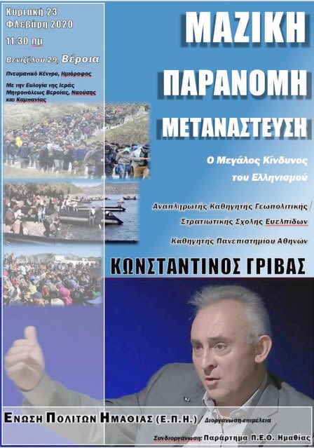Η Ένωση Πολιτών Ημαθίας(Ε.Π.Η.) διοργανώνει εκδήλωση με καλεσμένο ομιλητή τον κ Κωνσταντίνο Γρίβα, Αναπληρωτή Καθηγητή της Στρατιωτικής Σχολής Ευελπίδων, Καθηγητή της Σχολής Εθνικής Άμυνας, Καθηγητή της Σχολής Εθνικής Ασφάλειας και Καθηγητή Πανεπιστημίου Αθηνών. Το θέμα της ομιλίας είναι: «Μαζική παράνομη μετανάστευση – ο μεγάλος κίνδυνος του ελληνισμού».