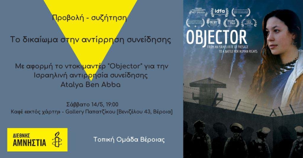 Το Σάββατο 14/5, στις 19:00 στο Καφέ «εκτός χάρτη» – Gallery Παπατζίκου (Βενιζέλου 43, Βέροια) βλέπουμε μαζί το ντοκιμαντέρ OBJECTOR για την Ισραηλινή αντιρρησία συνείδησης Atalya Ben Abba και συζητάμε με φόντο την επικρατούσα κατάσταση στο Ισραήλ και τα Κατεχόμενα Παλαιστινιακά Εδάφη, για την αντίρρηση συνείδησης, το δικαίωμα των πολιτών στην επιλογή, καθώς και τους αγώνες για να γίνει σεβαστό αυτό το δικαίωμα.