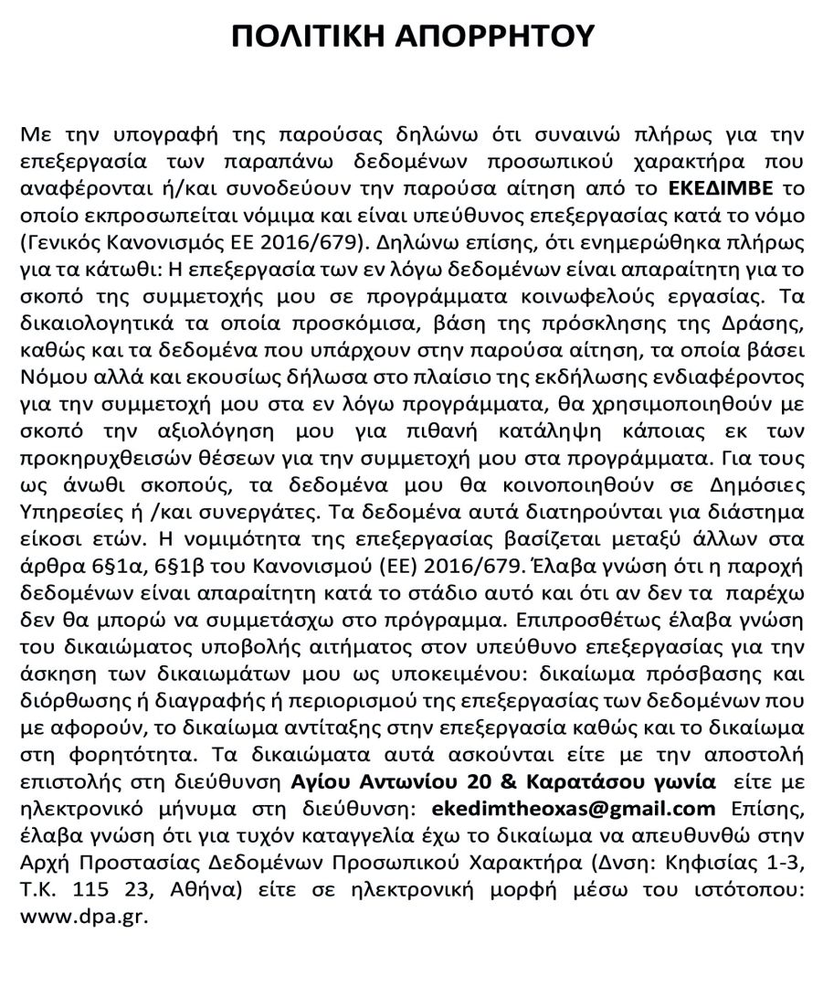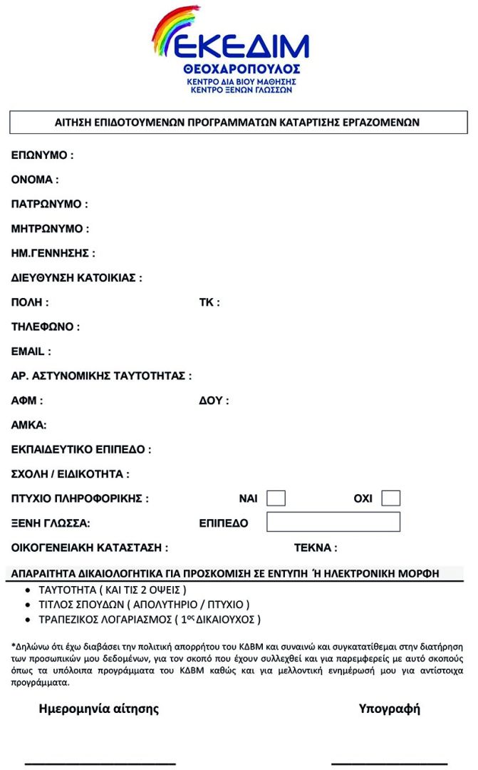 Η αντίστοιχη αίτηση να συμπληρώσετε και να μας αποστείλετε μαζί με τα δικαιολογητικά.