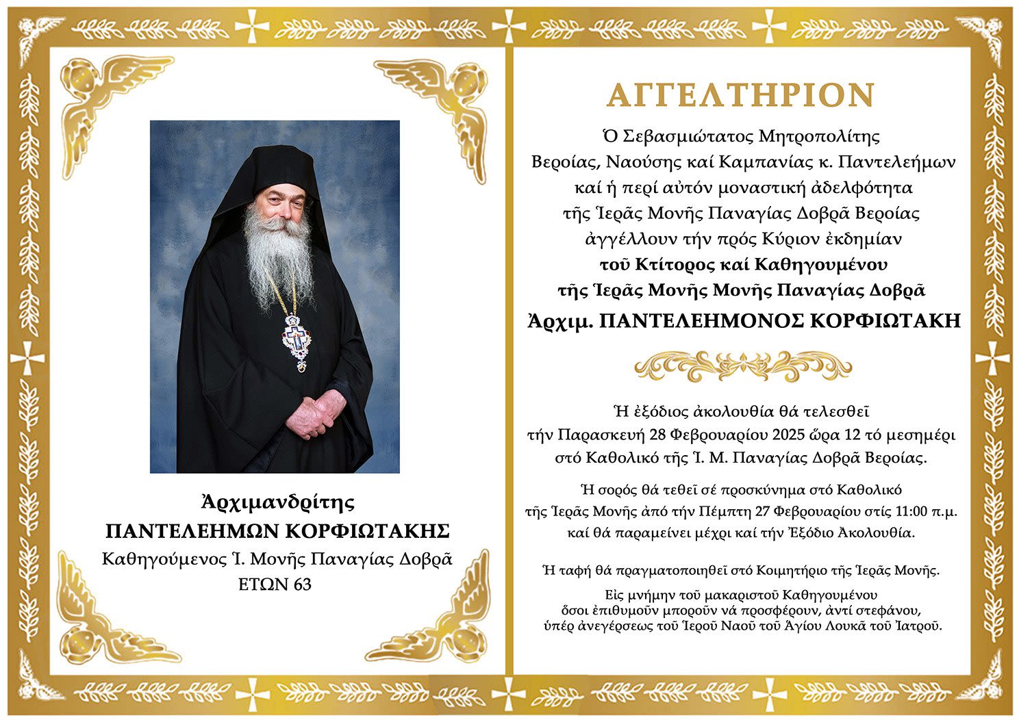 Ὁ Σεβασμιώτατος Μητροπολίτης Βεροίας, Ναούσης καί Καμπανίας κ. Παντελεήμων καί ἡ περί αὐτόν μοναστική ἀδελφότητα τῆς Ἱερᾶς Μονῆς Παναγίας Δοβρᾶ Βεροίας ἀγγέλλουν τήν πρός Κύριον ἐκδημία τοῦ μακαριστοῦ Κτίτορος καί Καθηγουμένου τῆς Ἱερᾶς Μονῆς Παναγίας Δοβρᾶ Βεροίας Ἀρχιμ. Παντελεήμονος Κορφιωτάκη (63 ἐτῶν).