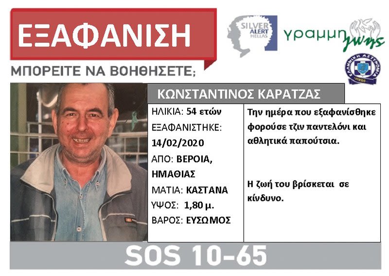 Ο 54χρονος Κωνσταντίνος Καρατζάς από τη Βέροια αγνοείται από την Παρασκευή 14 Φεβρουαρίου 2020.
